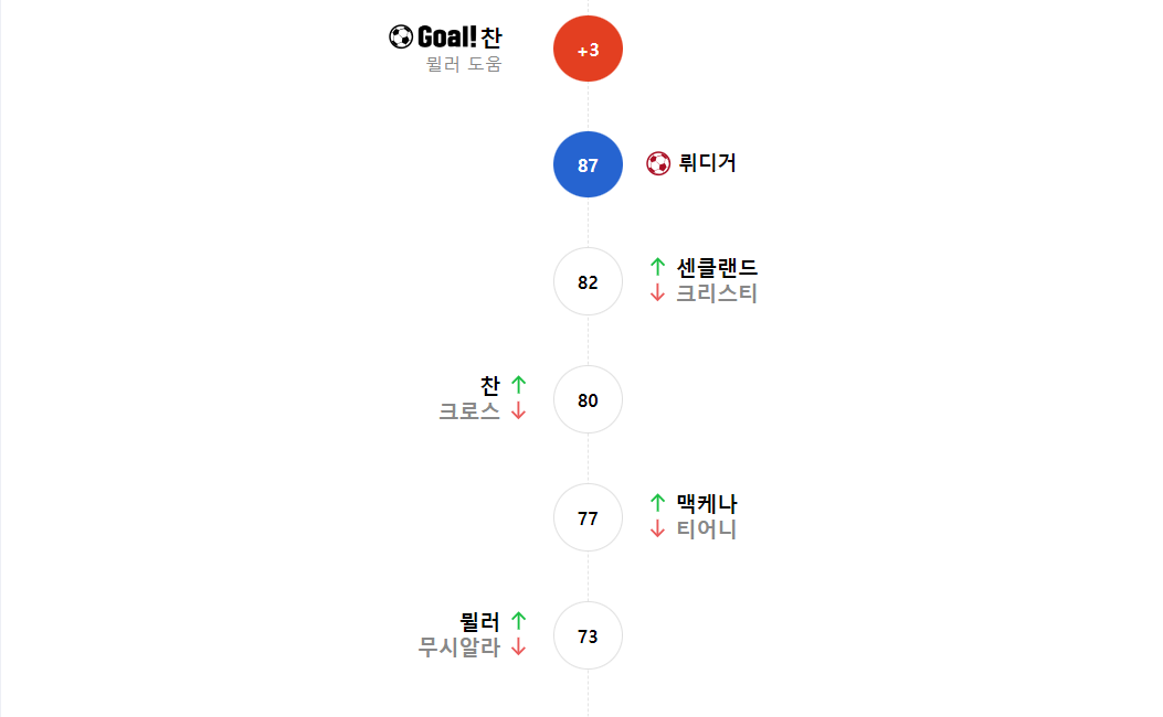 득점 | 도움 | 슈팅 | 유효슈팅 | 패스 | 인터셉트 | 패스차단 | 태클 | 파울 | 걷어내기 | 경고 | 퇴장 |