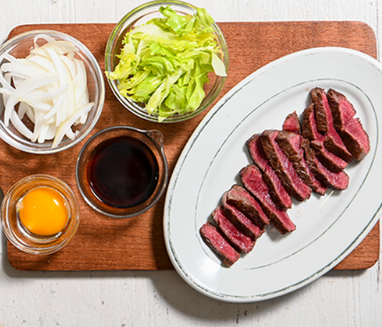 재료: 한우 안심 300g, 밥 180g, 버터 10g, 달걀노른자 1개, 양상추 30g, 양파 1/4개