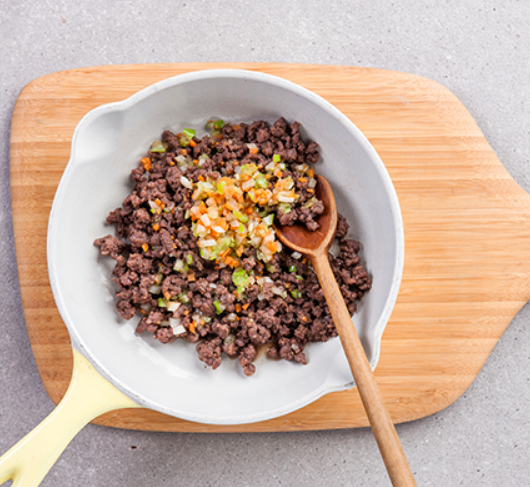 STEP2 팬에 다진 야채와 다진 한우를 넣고,시판용 불고기 양념에 볶는다.
