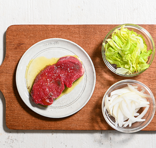 STEP1 안심은 키친타월로 핏물을 닦고 소금, 후추, 올리브오일을 뿌려 재운다. 양상추와 양파는 채 썰어 준비한다