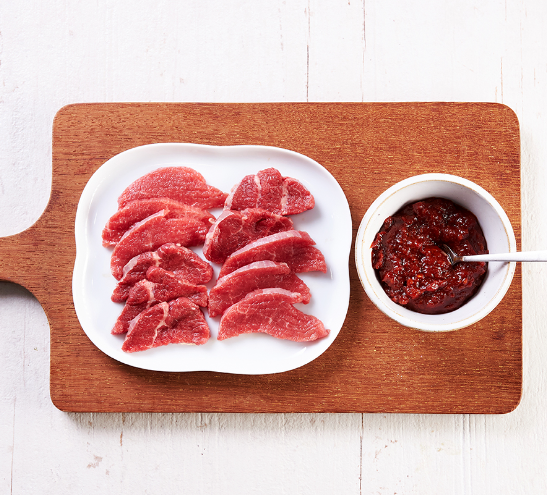 STEP1 홍두깨살은 핏물을 제거하고 육회용으로 썬다. 양념장을 만들어 육회용 고기에 넣고 빠르게 무친다.