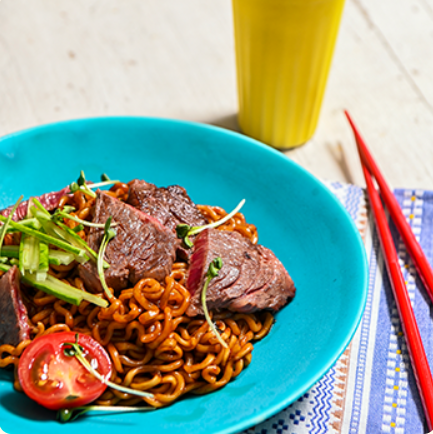 재료: 한우 토시살 300g, 짜파게티 1봉지, 너구리 1봉지, 무순·오이 약간 마리네이드 올리브오일, 소금, 후추 약간