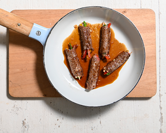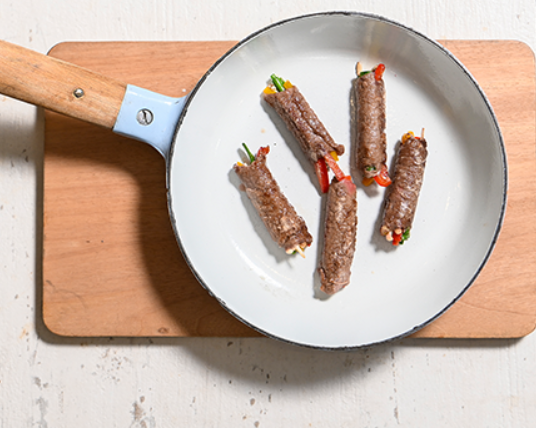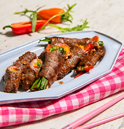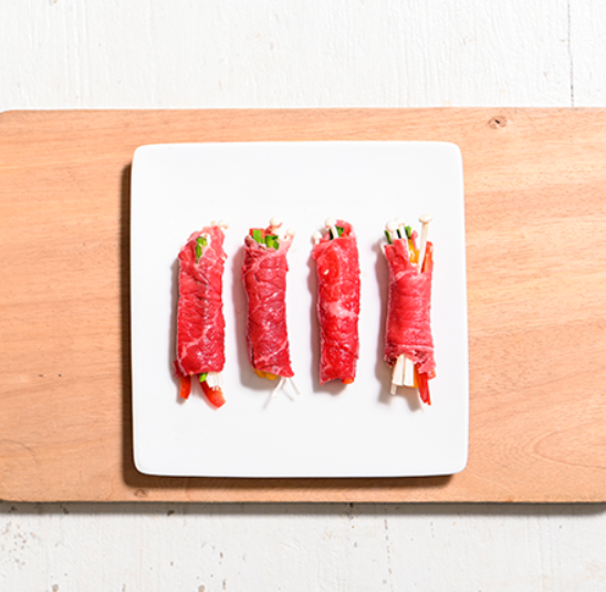 STEP2 불고기용 고기를 펴 그 위에 채소를 올려 돌돌 말아준다.