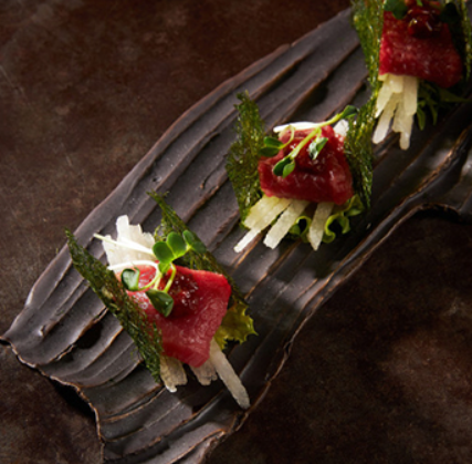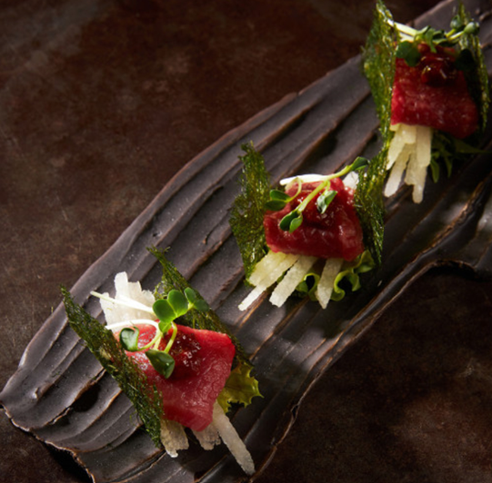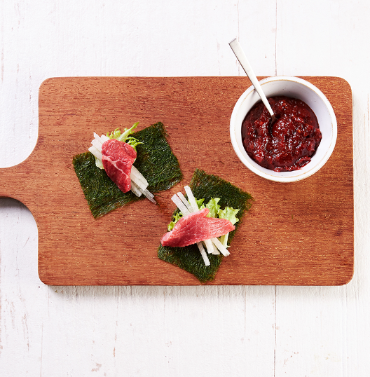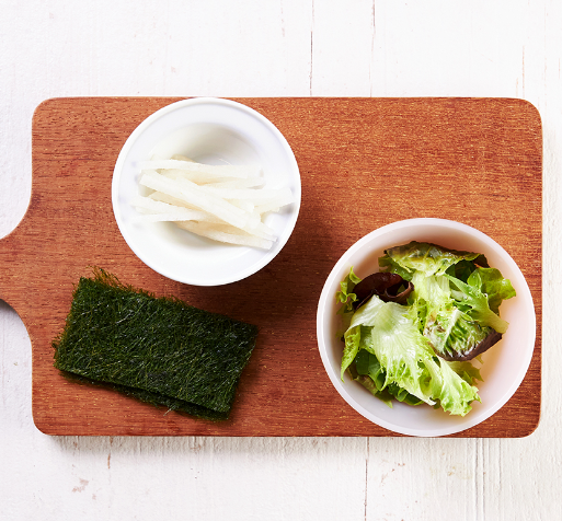 STEP4 감태를 깔고 그 위에 육회를 올린 다음 손질한 채소와 배, 무순을 올려 감태 양쪽을 감싸 완성한다.