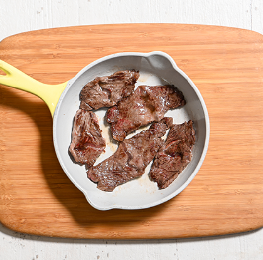 STEP2 달궈둔 프라이팬에 버터를 두르고 고기를 올려 구운 후 얇게 썬다.