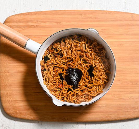 STEP3 짜파게티와 너구리 면을 끓여주고 물을 한 국자 남겨 짜파게티는 소스 1개, 너구리는 소스 1/2개를 넣고 섞어준다.