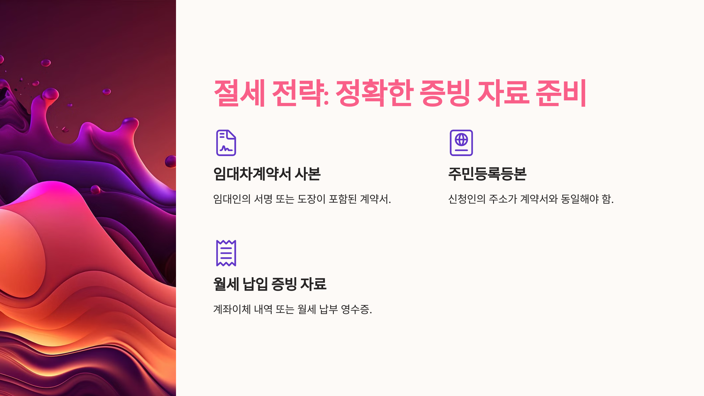 2025년 월세 세액공제 제도는 더 많은 세입자에게 큰 혜택을 제공합니다. 새로운 조건을 숙지하고, 지금부터 체계적으로 준비해 절세 효과를 극대화하세요!
